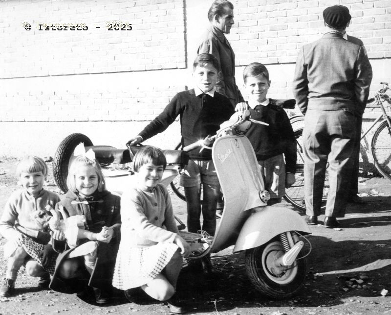 Bambini in posa davanti a una Vespa, Villaggio di Santa Caterina, Torino, seconda metà anni Cinquanta