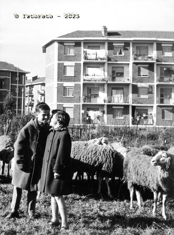 Ragazzi e pecore alle Case Rosse, Villaggio di Santa Caterina, Torino, 1956