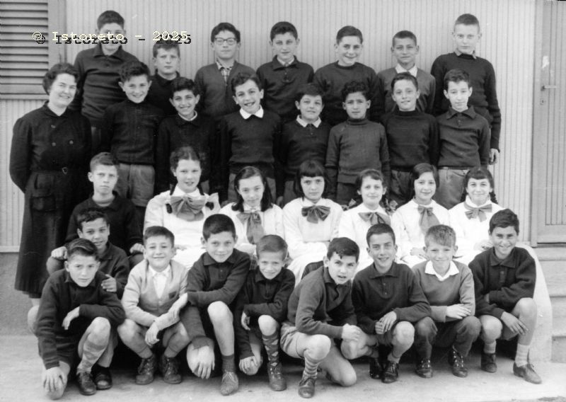 Una classe posa per la foto di gruppo davanti a una baracca della scuola, Villaggio di Santa Caterina, Torino, 1958