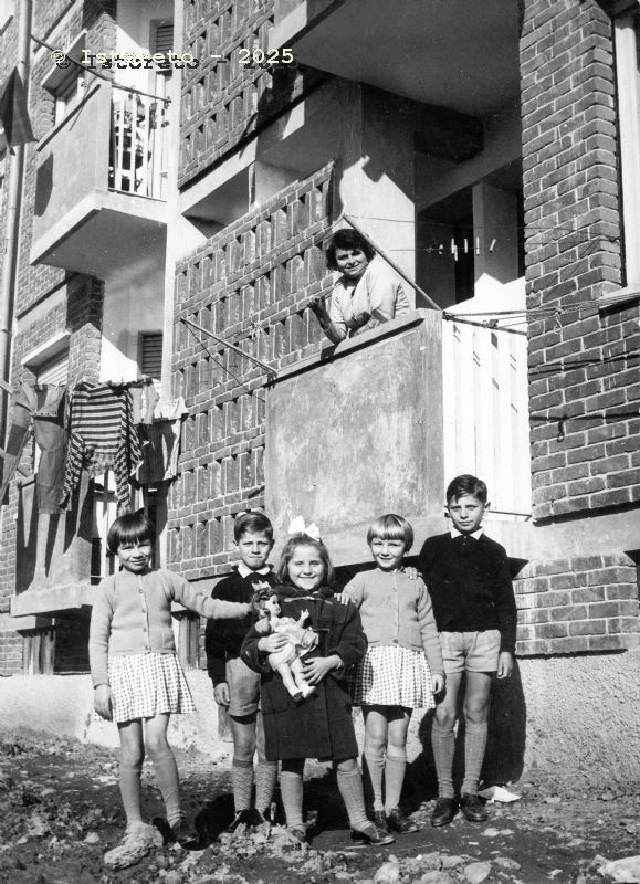 Figli di profughi davanti alle Case Rosse del Villaggio di Santa Caterina, Torino, 1956