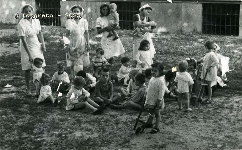 I bambini dell'asilo nel cortile del campo, Caserma Perrone, Novara, 1949