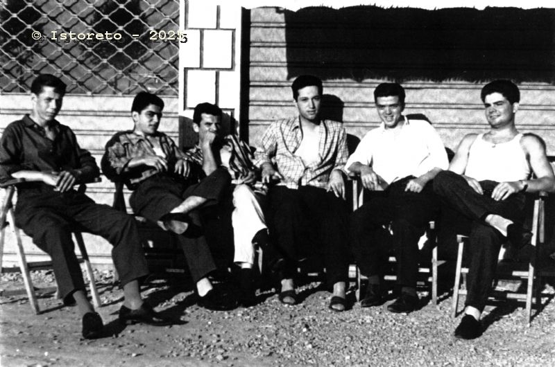 Gruppo di giovani seduti fuori dal bar del Villaggio Dalmazia, Novara, 1958