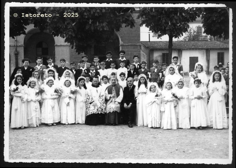 Prima comunione con il Vescovo Angeleri, Don Ballerini e il direttore del campo, Caserma Passalacqua, Tortona, prima metà anni Cinquanta