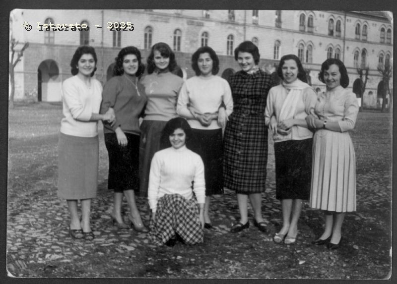 Foto di gruppo di ragazze profughe nel cortile del campo, Caserma Passalacqua, Tortona, seconda metà anni Cinquanta