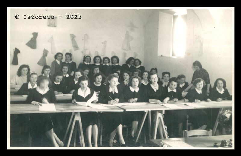 Foto di gruppo delle partecipanti al corso di taglio e cucito, Caserma Passalacqua, Tortona, 1950