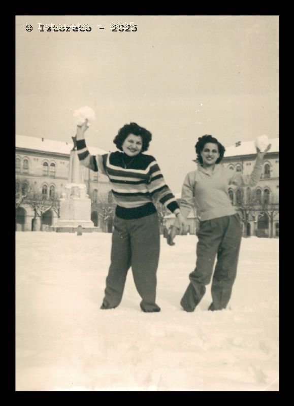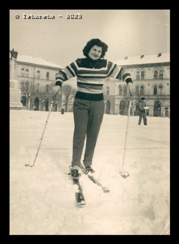 Profuga giuliano-dalmata con gli sci nel cortile della Caserma Passalacqua a Tortona