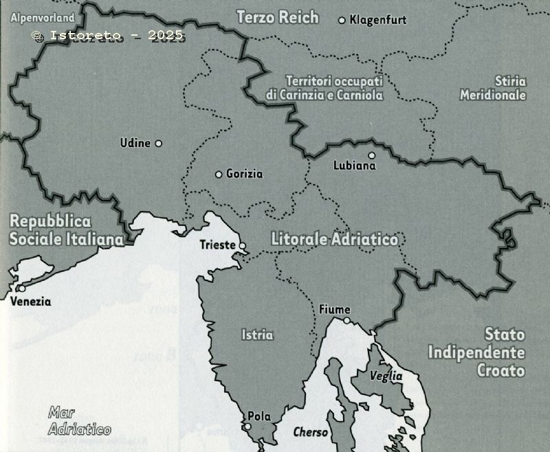Istituito il 1° ottobre del 1943, l'Adriatisches Kunstenland si pone come una realtà separata dalla Repubblica Sociale mussoliniana, che continua a mantenere in forza sul territorio propri militari e funzionari, la cui attività è però completamente subordinata al comando tedesco, unica autorità ufficialmente riconosciuta.